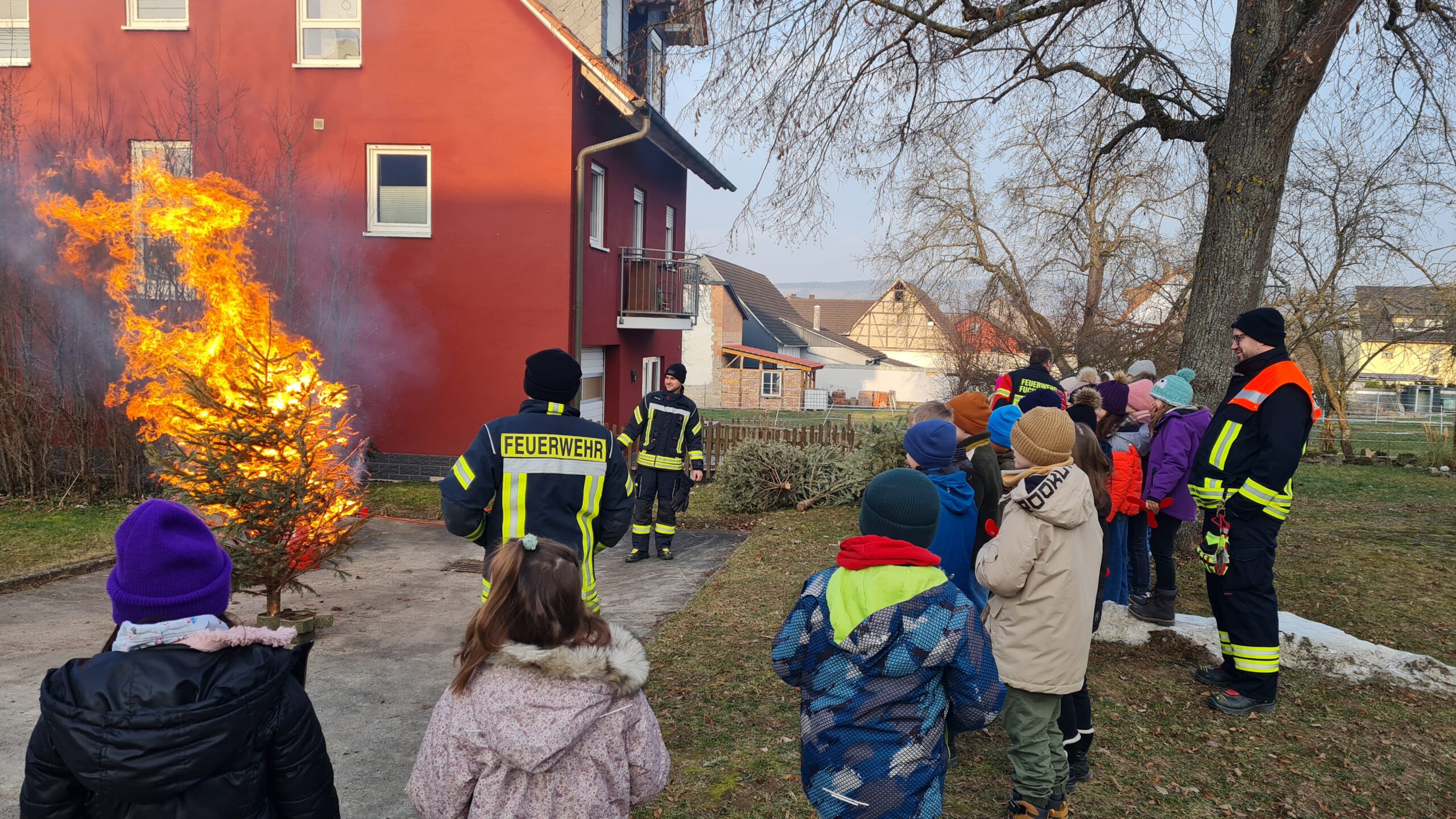 Am Ende stand noch ein Highlight auf dem Programm. Ein Tannenbaum wurde kontrolliert entzündet, um zu demonstrieren, wie rasch sich ein Brand ausbreiten kann: Nach etwa 20 Sekunden stand er bereits lichterloh in Flammen. Die Wärmebildkamera zeigte dabei
